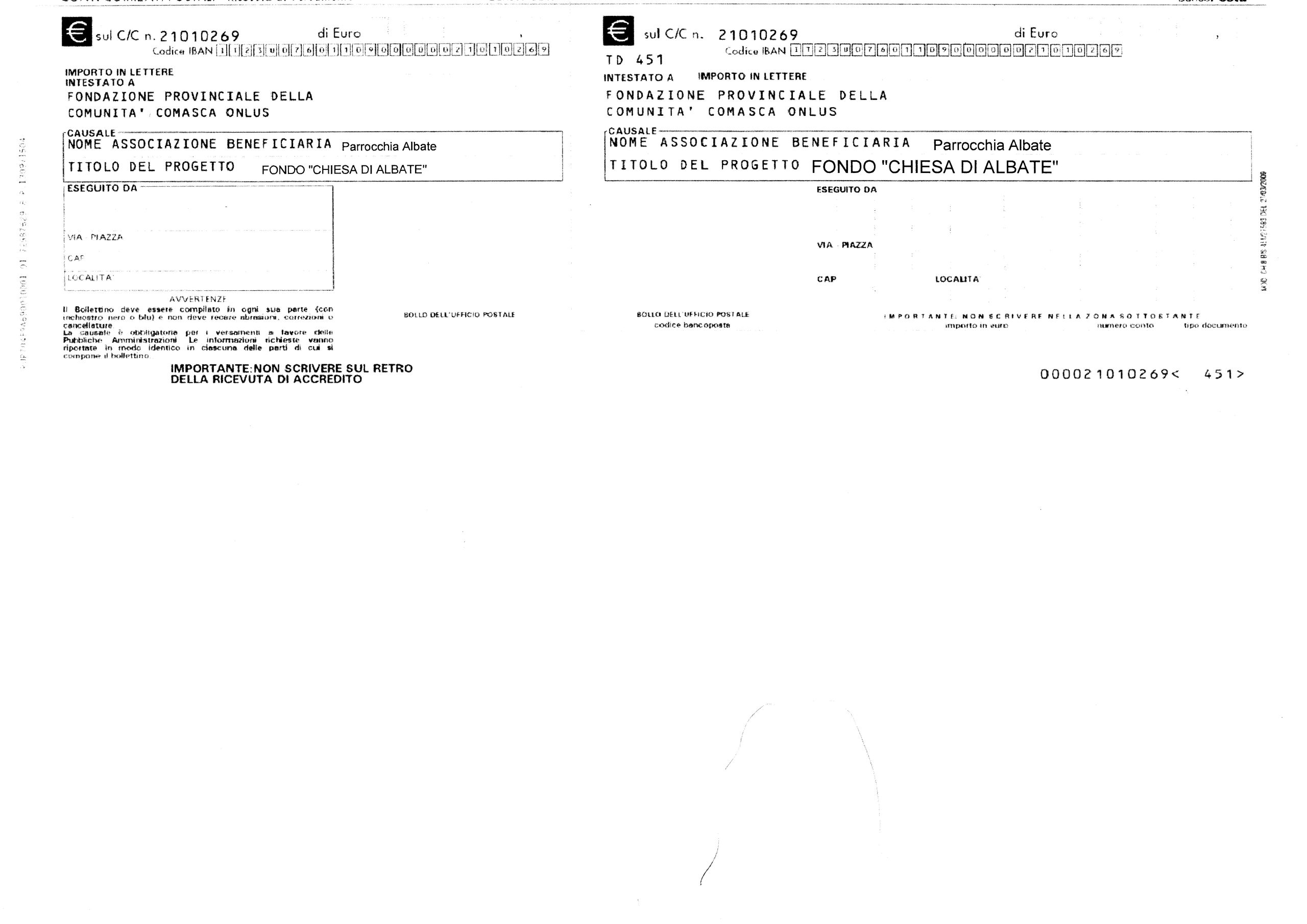 -come causale di versamento: FONDO CHIESA DI ALBATE